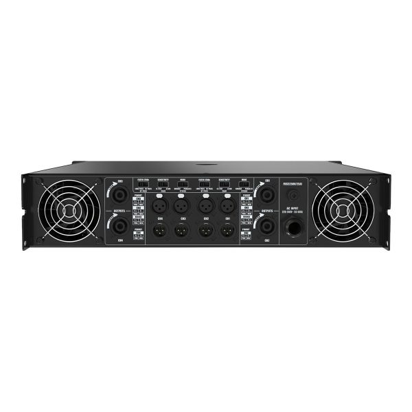 Mặt sau của thiết bị được trang bị đầy đủ các cổng kết nối chuyên dụng, bao gồm các cổng XLR và cổng speakon, cho phép kết nối dễ dàng với nhiều loại thiết bị âm thanh khác nhau.